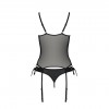 Passion's Nessy corset, in black tulle and leather, has adjustable rings and ribbons that create a sensual and sophisticated intertwining. The open thong and garter straps complement the look, offering elegance and comfort.