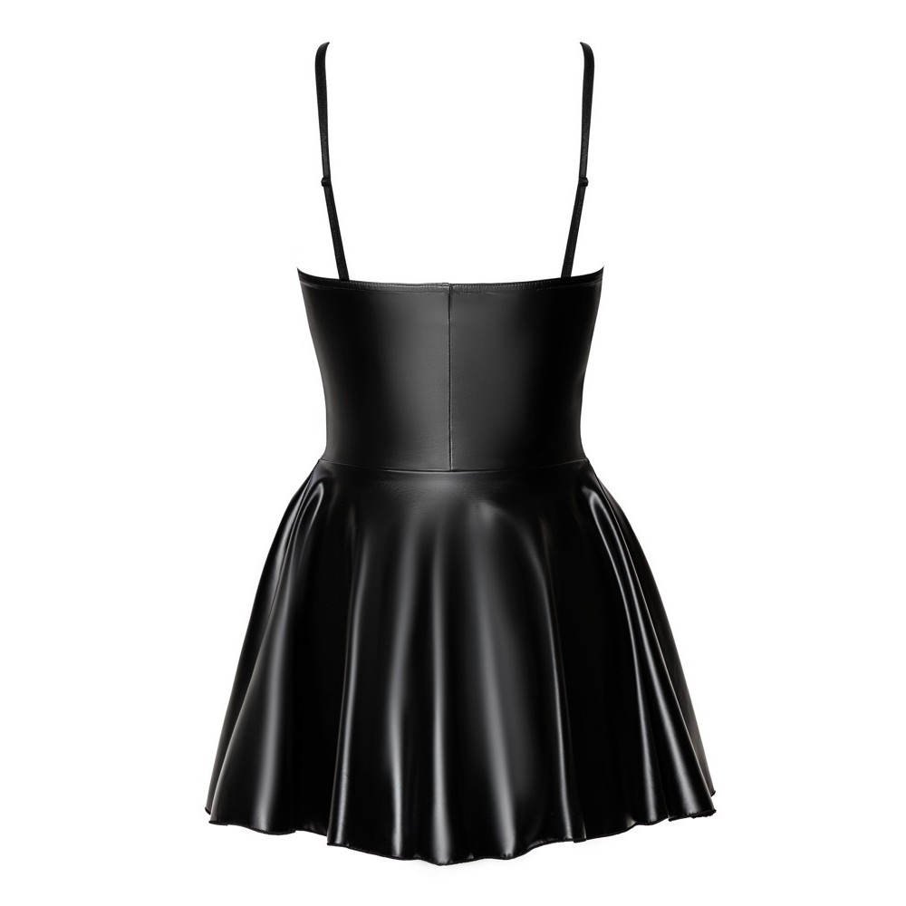 The black mini dress from Noir is made entirely of shiny and matte power wetlook. It is also soft and stretchy for maximum comfort. It has a skin-tight corset top and a wide, flowing skirt. It is strapless, but adjustable straps are included for a different style. It has a zip fastening at the front that goes up to the waist of the skirt.