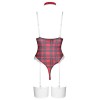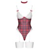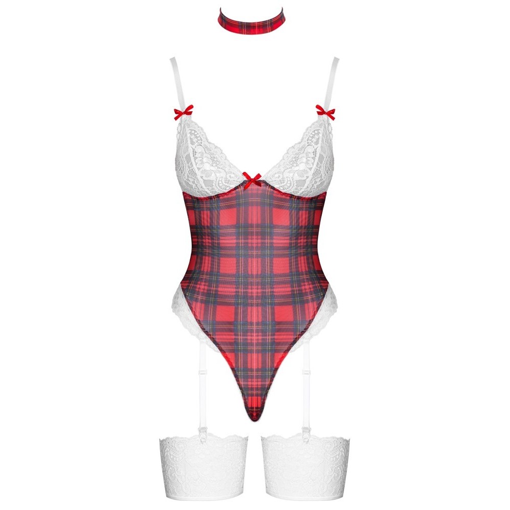 The daring lingerie set from Cottelli LINGERIE includes a bodysuit with suspenders and a choker. The bodysuit features a plaid pattern, white lace cups without underwire, and small decorative red bows.