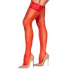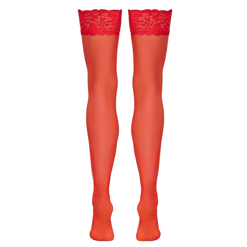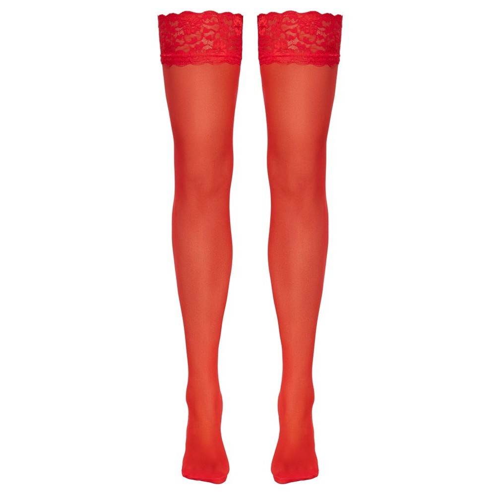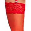 The velvety soft, red stockings from Cottelli LEGWARE have stretchy 9 cm wide lace around the top. 20 denier. Oeko-Tex certified.