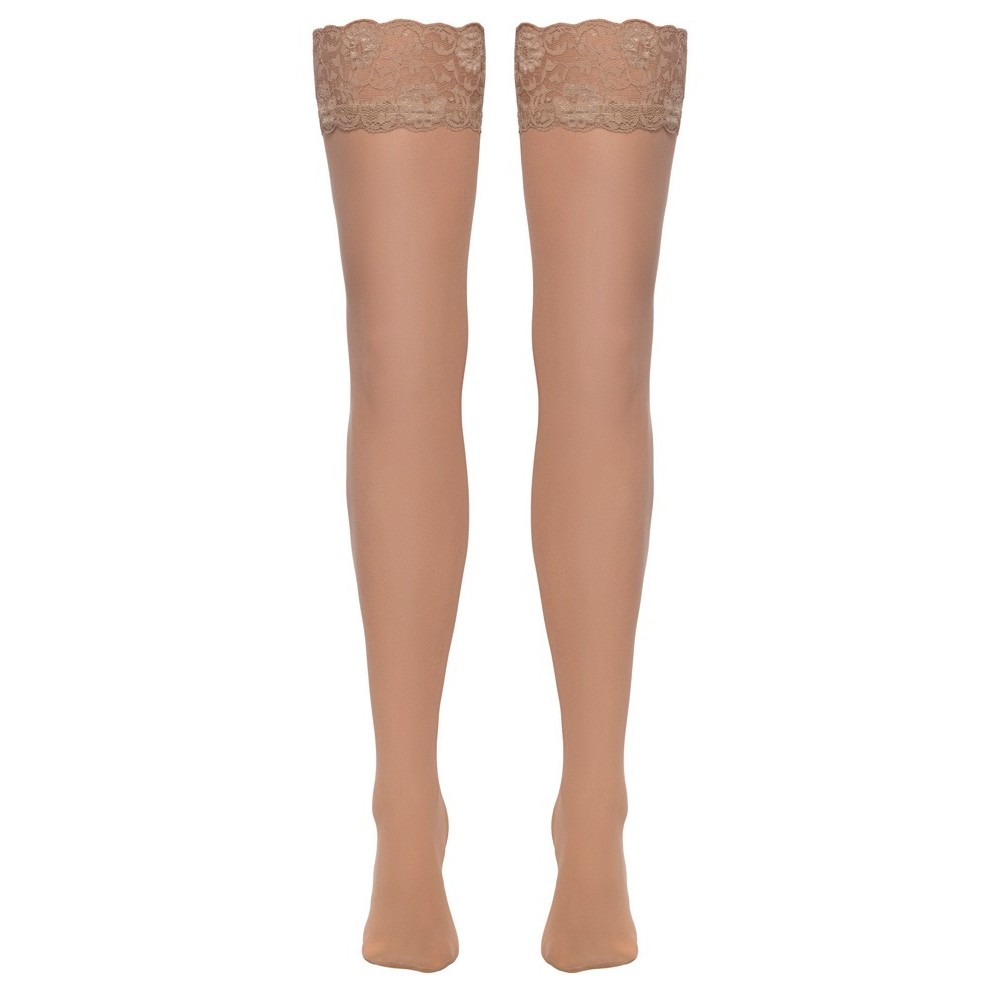 The velvety soft, nude-coloured stockings from Cottelli LEGWARE have stretchy 9 cm wide lace around the top. 20 denier. Oeko-Tex certified.