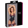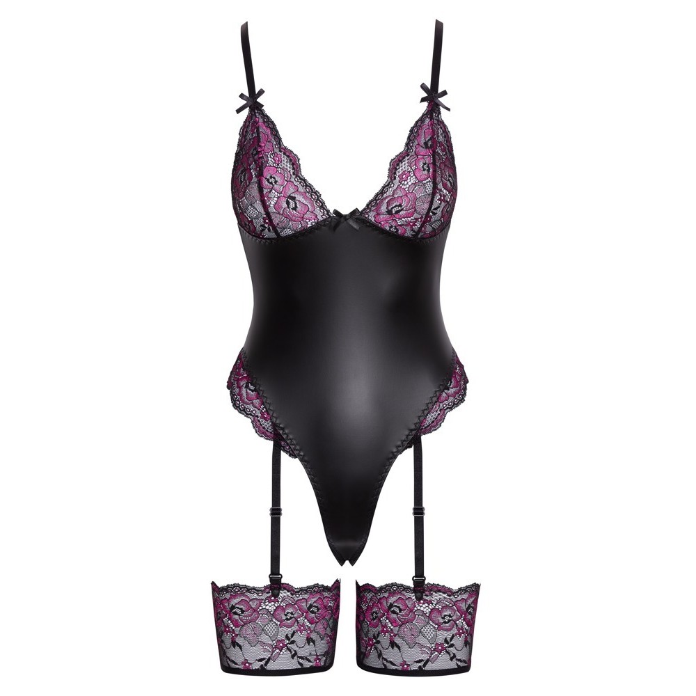 The elegant teddy with garters by Cottelli LINGERIE has removable straps and garters. It is made of sophisticated matte black material, combined with delicate lace in two colours (pink and black), and adorned with small black bows.