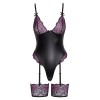 The soft and stretchy thong-style teddy features lace cups without underwire and extra-high leg cuts, also decorated with lace, which enhance the silhouette. It also includes a practical press stud fastening in the crotch area. The bra straps and suspenders are adjustable, and the suspender straps can be removed. The wide, elasticated suspenders can also be worn separately.