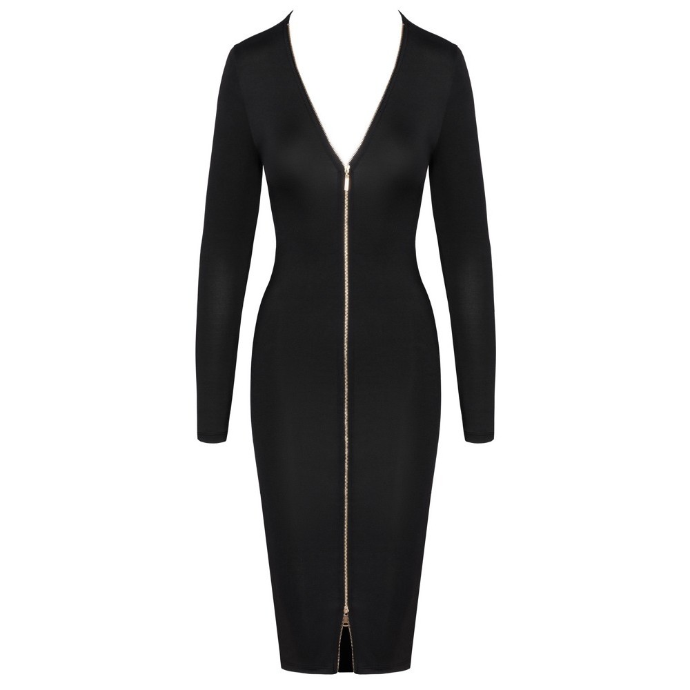 The long-sleeved black dress from Cottelli PARTY is in a tight-fitting, tapered and knee-length design. There is a gold-coloured 2-way zip at the front that can be unzipped from the top or the bottom. The delicate but stretchy material clings gently to the body, which means that it is very comfortable to wear and move in.