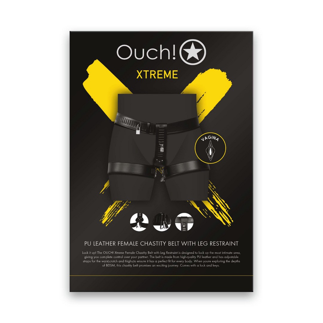 Pu Leather female chastity belt with leg restraint sell sheet (OU1029BLK) in English.