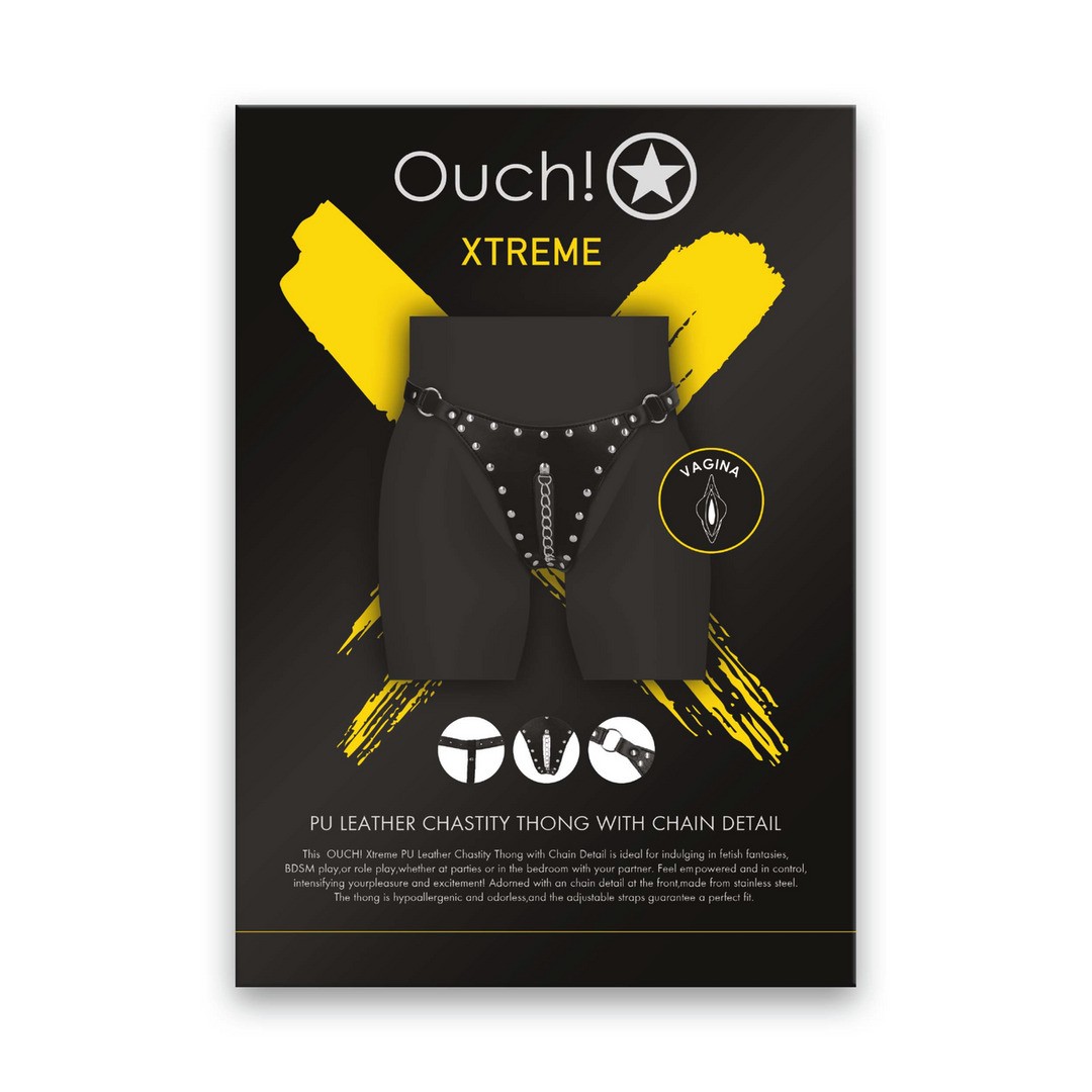 Pu Leather female chastity belt with leg restraint sell sheet (OU1030BLK) in English.