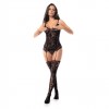 Fishnet bodystoking with floral motifs, built-in suspenders and stockings, for a bold and elegant look.