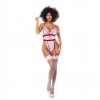 Sexy striped knit nurse costume with lace, thong, and cap, perfect for seduction.