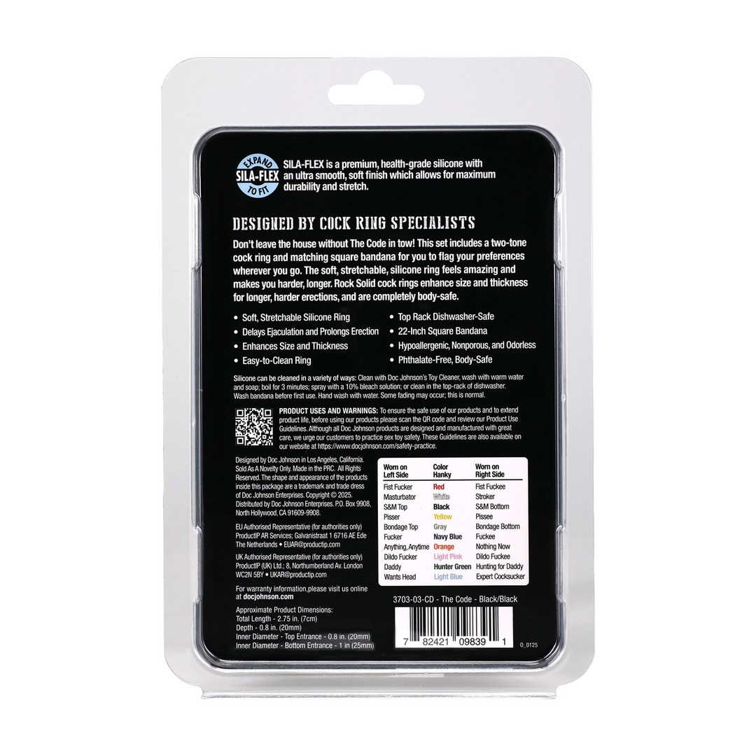 Don't leave home without The Code! This set includes a two-tone penis ring made of soft, stretchy silicone, along with a matching square bandana, so you can signal your preferences wherever you go.