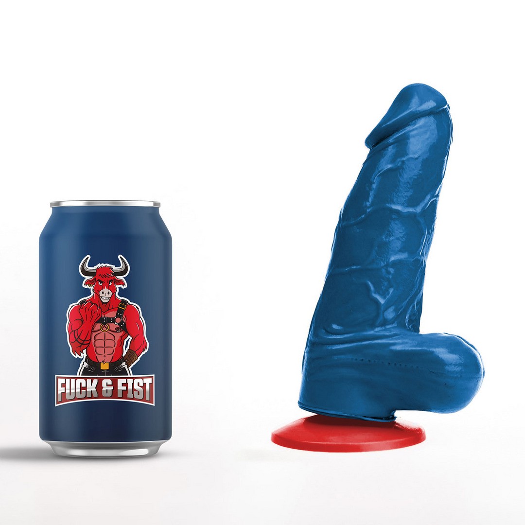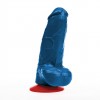 Elegant blue dildo with red suction cup. Features a realistic shape, veined surface and glans without foreskin, offering a striking look and intense stimulation. Generous dimensions, with an insertable length of 12 cm and maximum width of 5 cm. Made from PVC.