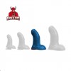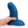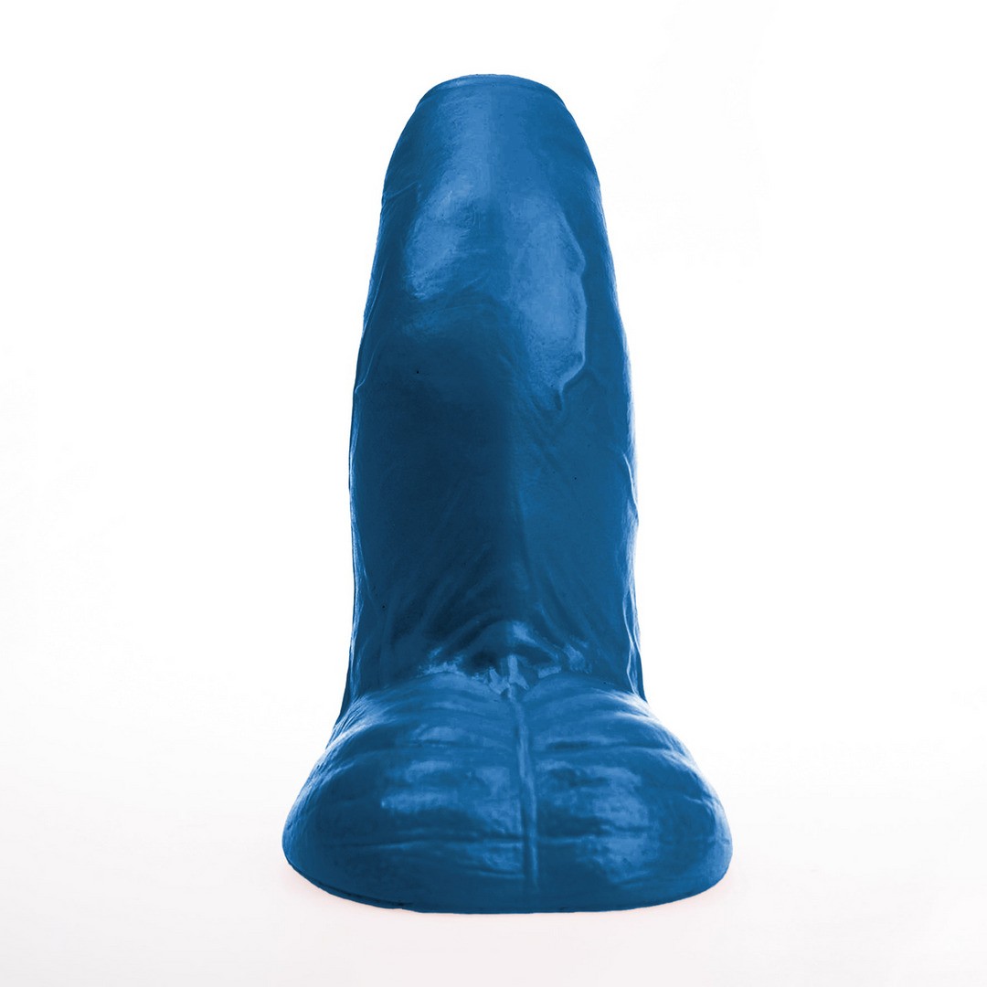 Curved shape that follows the body, with detailed glans covered by foreskin.
