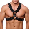 Genuine black leather harness with metal rings and buckles, ideal for enhancing the torso, manufactured in Europe.