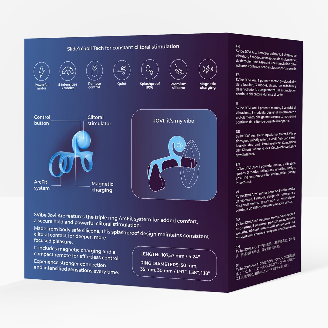 The SVibe Jovi Arc features the ArcFit triple ring system, ensuring greater comfort, secure fit and intense clitoral stimulation. Made from body-safe, splash-proof silicone, it maintains constant contact with the clitoris, providing deep, concentrated pleasure.