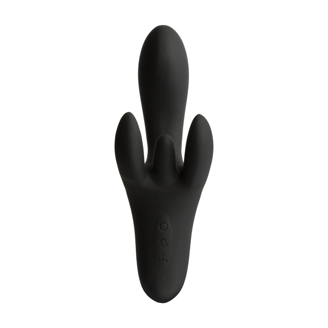 Dual stimulation: curved shaft to stimulate the G-spot and external prongs for the clitoris and labia.