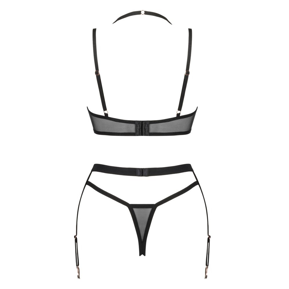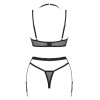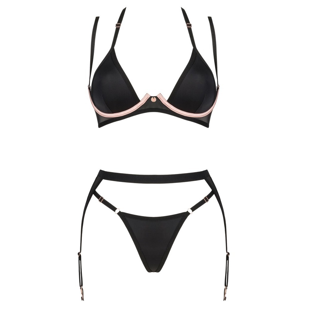 Elegante conjunto de lencería Selinne by Obsessive de 3 piezas compuesto por sujetador con aros, liguero y tanga. Mezcla de suave malla elástica negra y microfibra. Sujetador de copas con ribetes rosas en contraste. El cierre de corchete en la espalda, así como el escote que se anuda en el cuello y los tirantes son regulables para un ajuste perfecto. El liguero también tiene cierre de corchete en la espalda y ligueros con pinzas a cada lado.