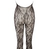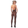 Catsuit negro de delicada malla, con un diseño halterneck que realza el escote, adornado con tres elegantes perlas. Sin entrepierna y con pies integrados, combina sensualidad y comodidad en una prenda única y envolvente.