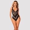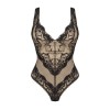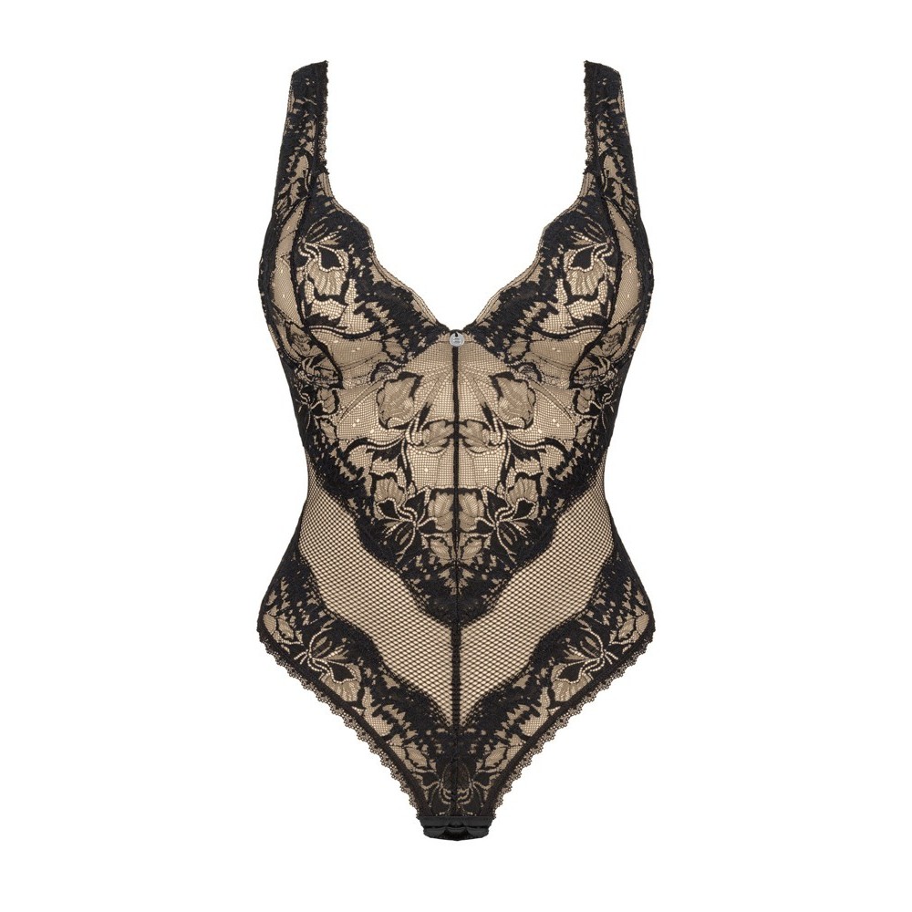 Body Olvidia con espalda bellamente decorada y parte delantera forrada en tejido beige. El diseño incluye copas con aros para realzar el busto, tirantes ajustables y cierre regulable en la espalda y la entrepierna para un ajuste perfecto. El sutil encaje promete noches románticas y llenas de placer, mientras que el tejido es suave y agradable al tacto.