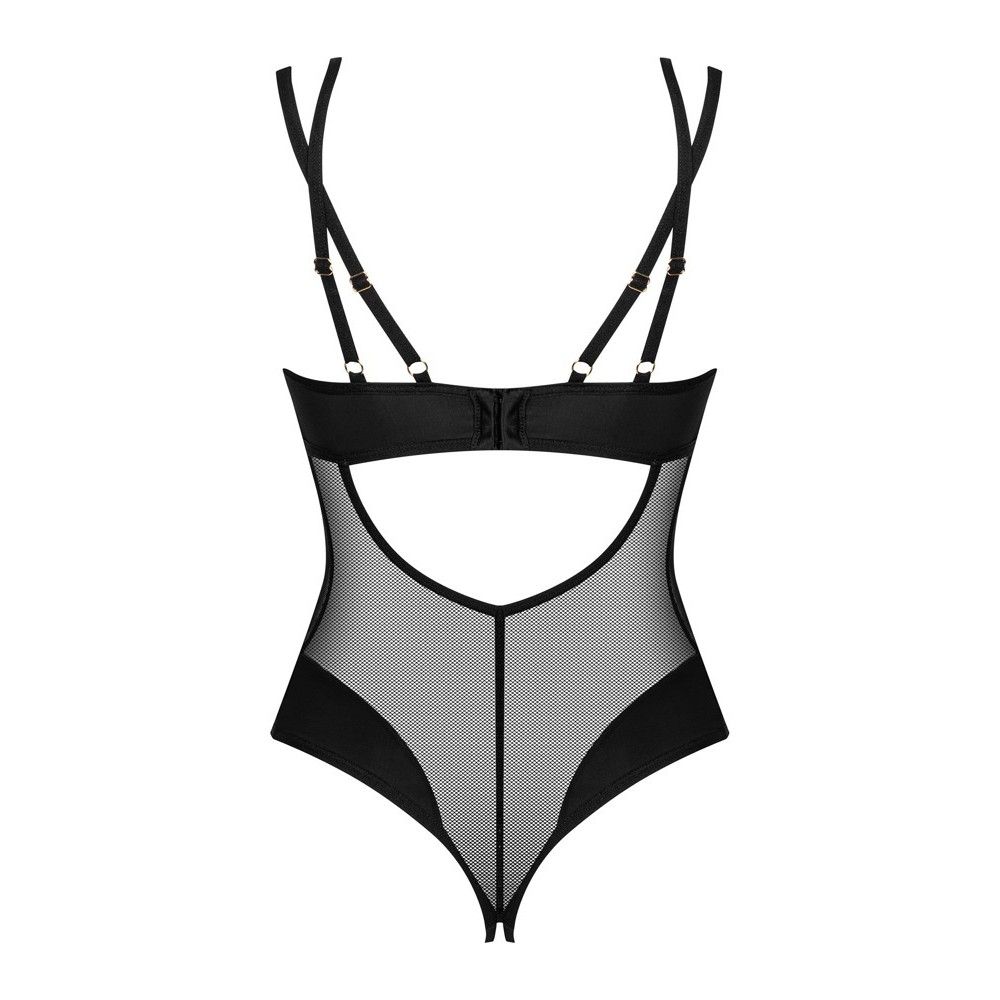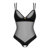 Body Nesari negro sin entrepierna de Obsessive, confeccionado en tejido elástico fino con detalles opacos. Suave y flexible en todo el cuerpo, proporciona una gran comodidad. El sujetador presenta un elemento decorativo entre las copas y un cierre de gancho ajustable en la parte inferior de la espalda. Los tirantes cruzados dobles son ajustables para un ajuste perfecto. La entrepierna, con dos tiras de cordón, queda seductoramente al descubierto.