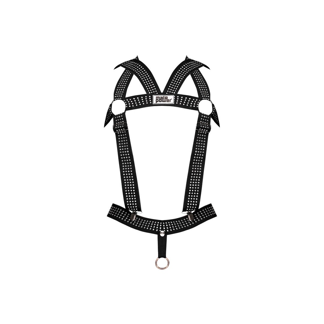Arnés corporal masculino Male Power con bandas elásticas, anillo para el pene de silicona y detalles metálicos ajustables.