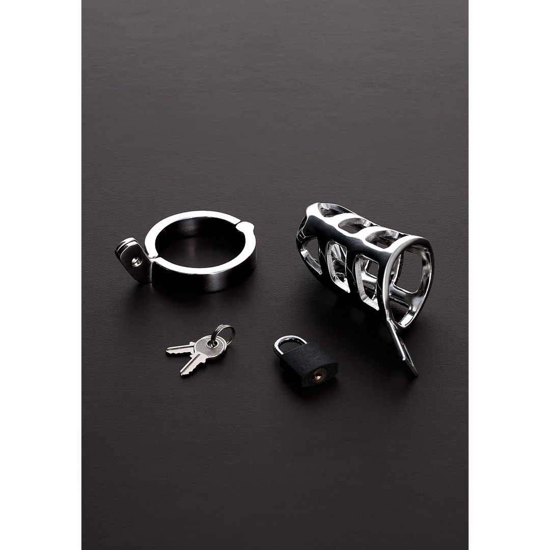 Jaula de castidad de acero inoxidable, resistente y cómoda, ideal para juegos BDSM.