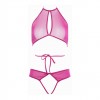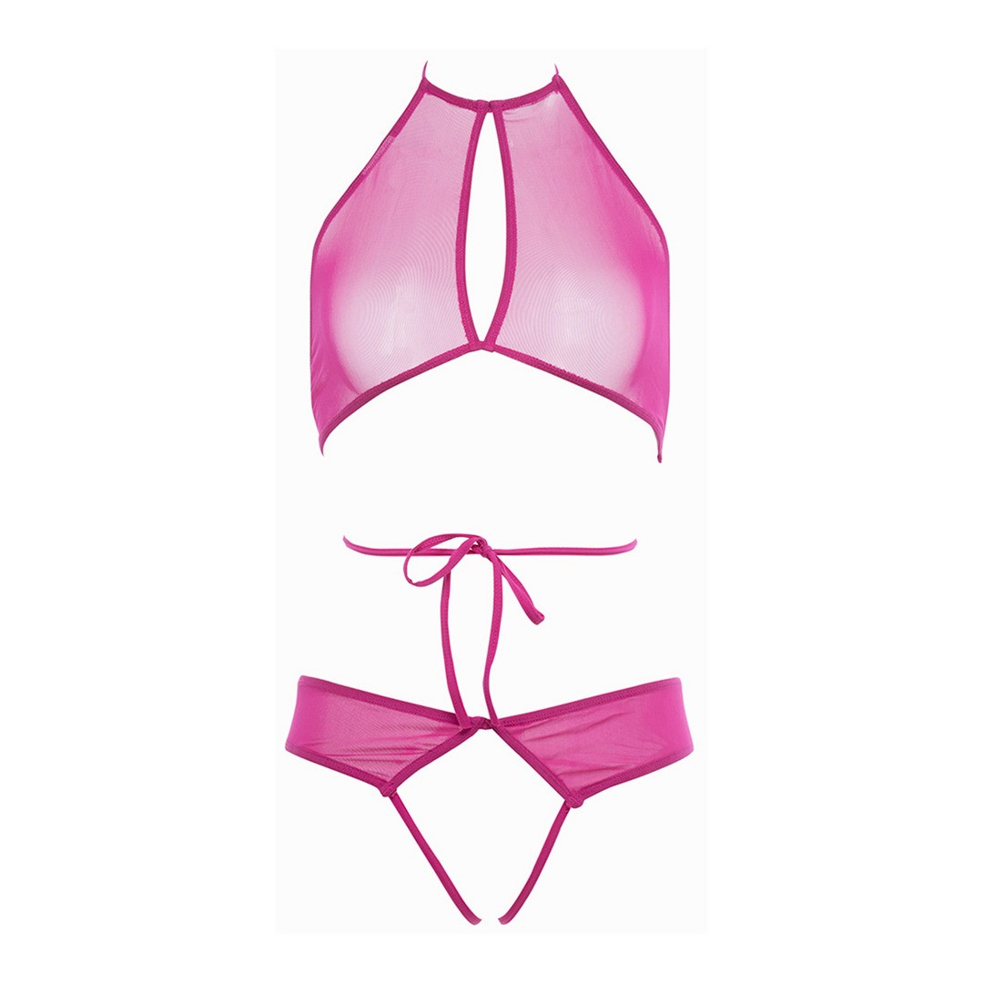 Este conjunto es una mezcla de Sporty Spice, con el clásico halter que apenas cubre tus activos y rodea la cintura por debajo del pecho para un máximo dramatismo. Braguita totalmente abierta con tiras de encaje en la espalda. ¿Qué más se puede soñar?