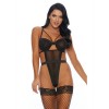 Elegante body con copas con aros sin forro, tirantes finos ajustables y tanga de pierna alta con cierre, presentado en caja.
