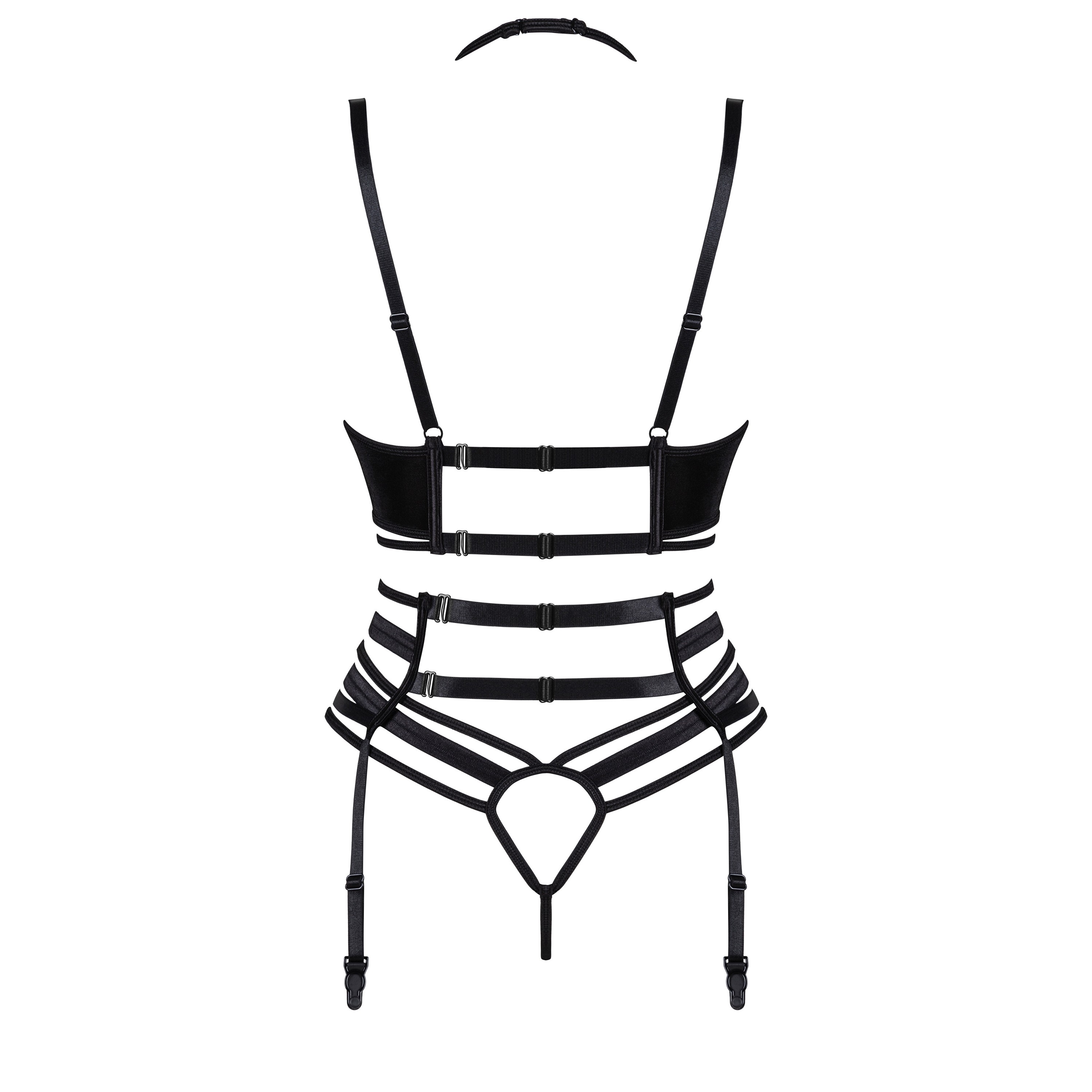 Un conjunto extremadamente lujoso y sexy. Se compone de un sujetador sofiticado de corte original, un tanga y un liguero. Este conjunto está acabado con un delicado encaje para darle un toque sensual.