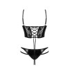 El Conjunto Nirvina es un exquisito conjunto de lencería que encanta con su combinación de encaje y material brillante similar al látex. El top corto con aros, unido a la braguita mediante un broche, se asemeja a un elegante body.