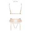Conjunto de lencería clásica en color nude, compuesto por sujetador, braguitas y liguero.