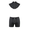 Tiene un aspecto misterioso y alocado. Se compone de calzoncillos con cremallera para exponer algo de masculinidad y un cuello que estimula la imaginación. Todo está confeccionado en ecopiel negra.