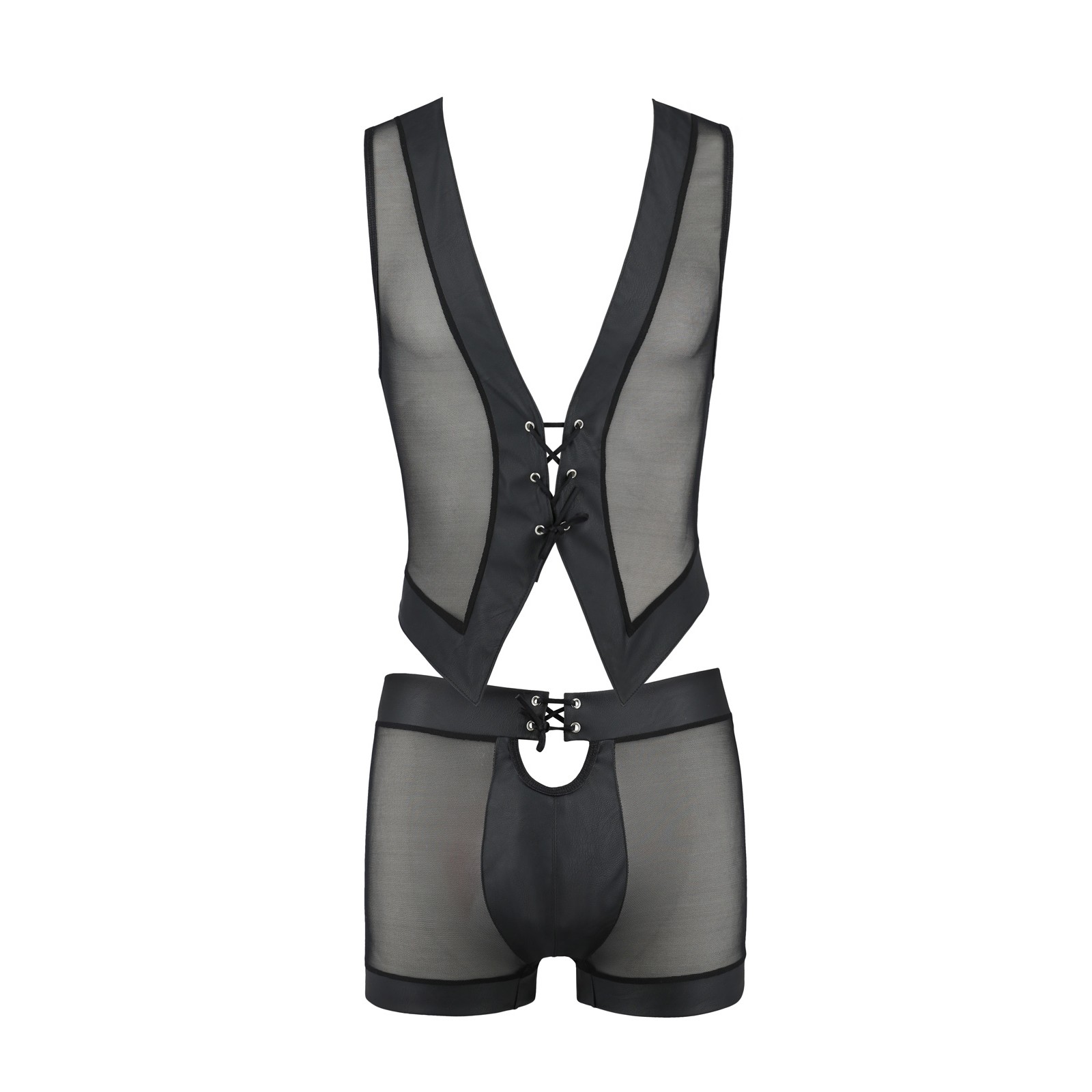 Está hecho de una combinación de cuero y tul negro. Tanto el chaleco como los boxers tienen una divertida conexión de corsé que añade un toque sensual. También es la opción ideal para bailarinos eróticos. Este disfraz atrae todas las miradas!