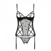 El corpiño, con copas y aros reforzados, realza con encanto la cintura y el busto, mientras que los recortes en la parte superior del sujetador y en los laterales del corpiño, adornados con tirantes entrelazados, crean un look atrevido y provocativo.