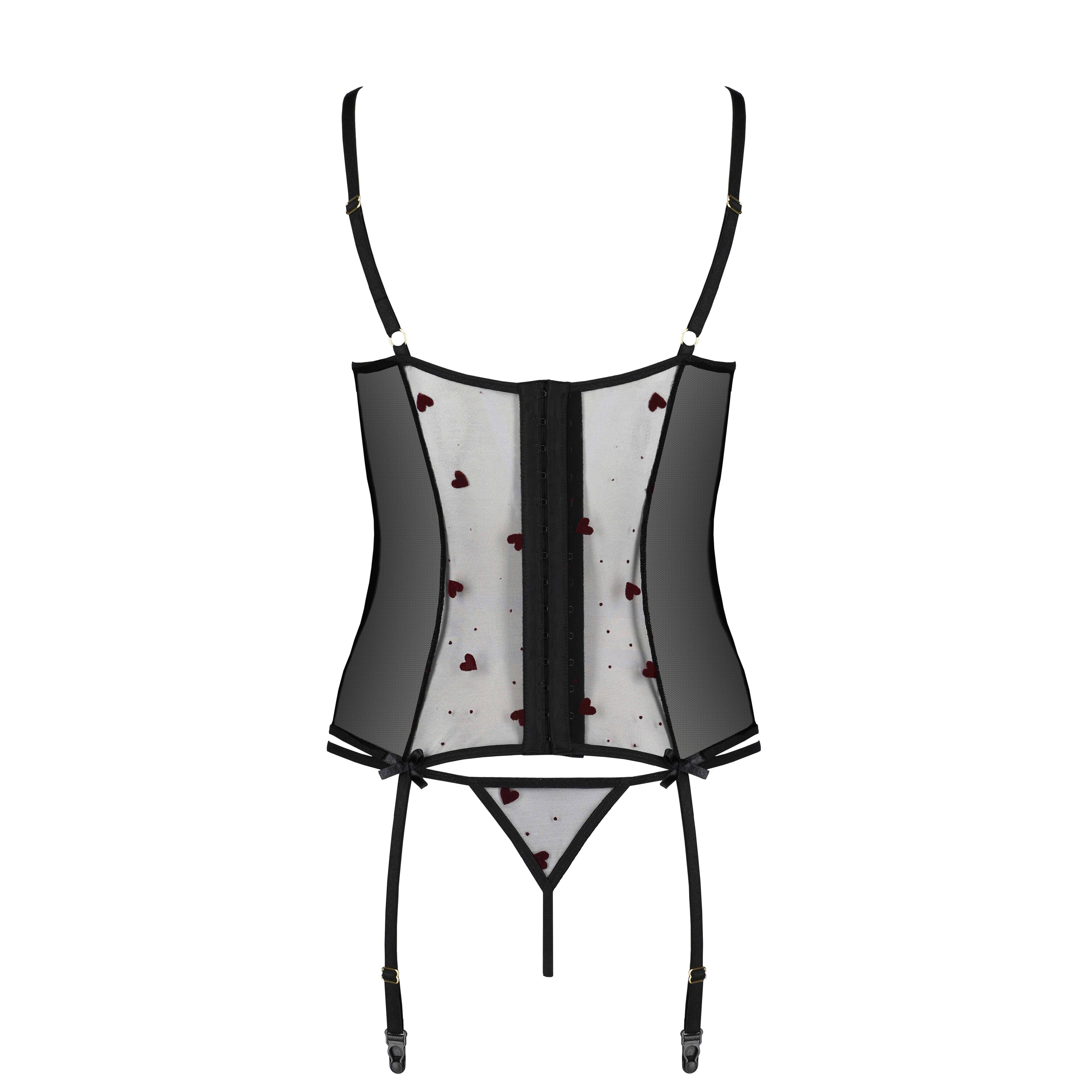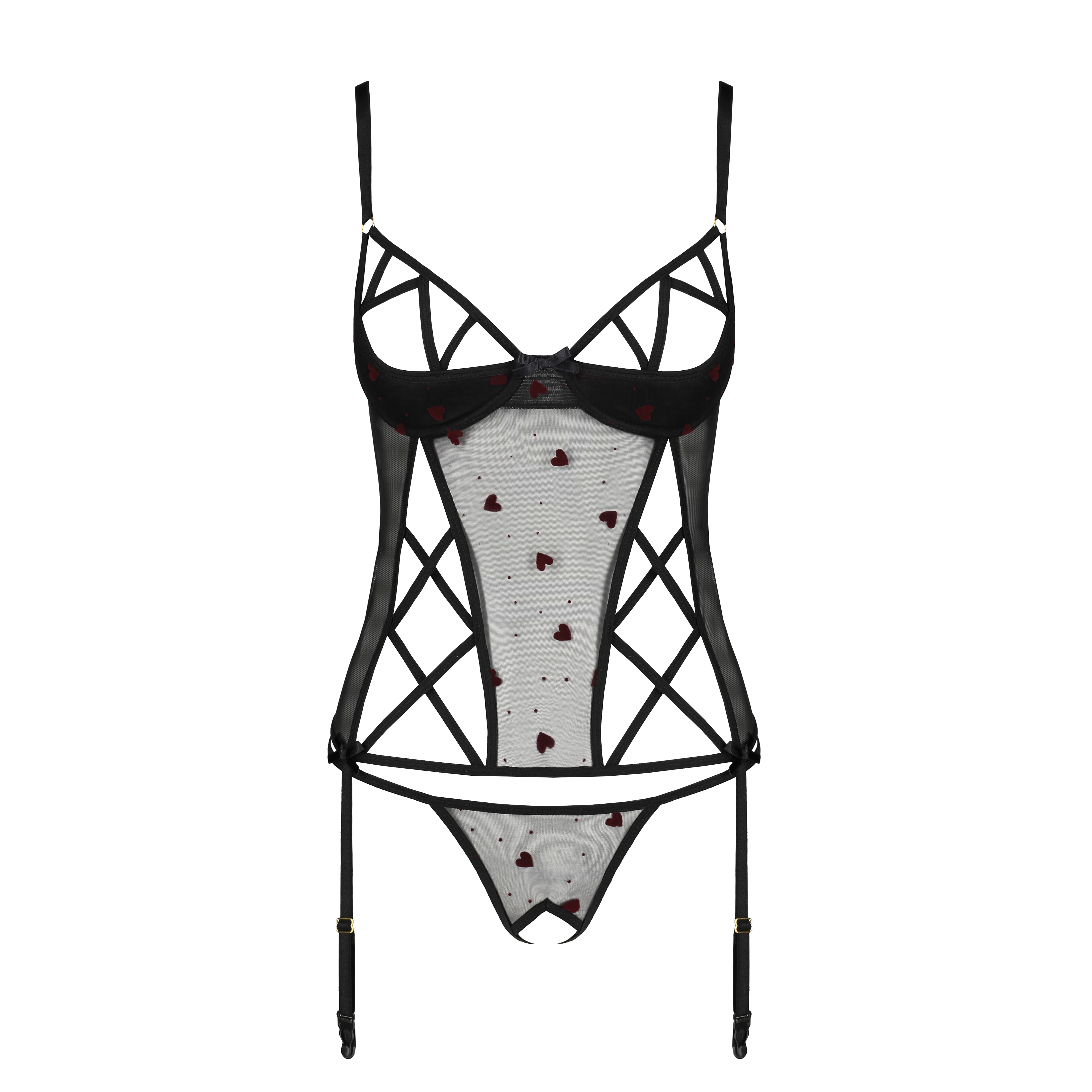 Confeccionado en tul con estampado de corazones, este conjunto es una combinación perfecta de romanticismo y seducción.