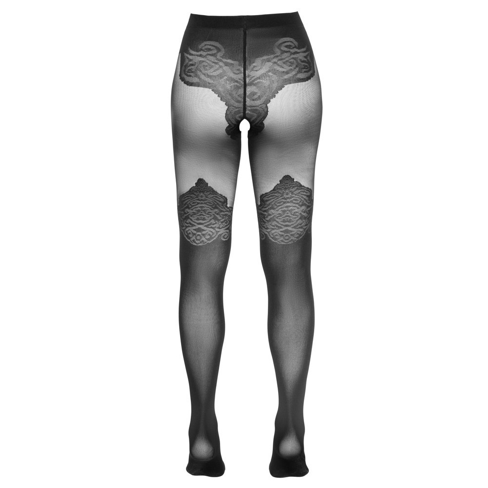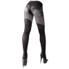 Bas noirs Cottelli LEGWARE au design extravagant, montant au-dessus du genou. La zone du string et les jambes jusqu'aux cuisses sont en matière opaque, créant un contraste avec la zone d'entrejambe ouverte, qui ajoute une touche audacieuse. La matière délicate et élastique épouse parfaitement les formes du corps, mettant en valeur la silhouette et rendant les jambes encore plus séduisantes. 40 deniers et 20 deniers. Certification Oeko-Tex.