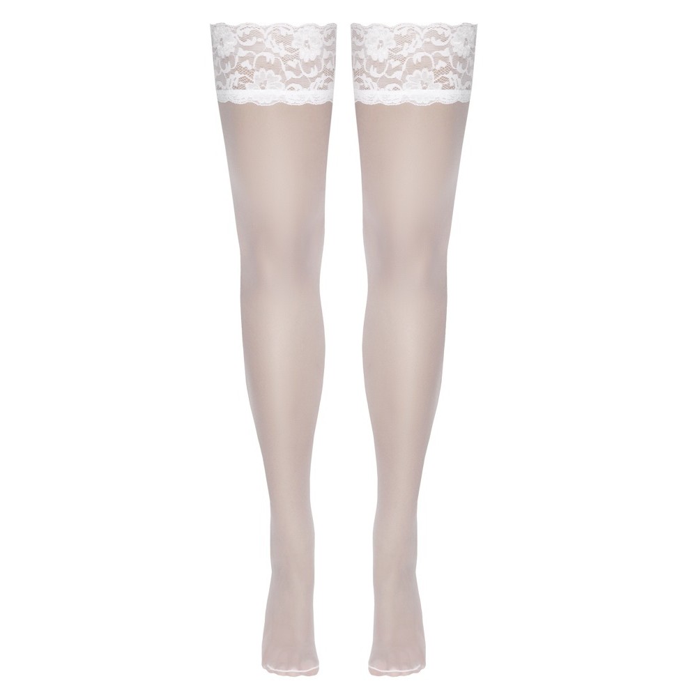 Bas à jarretières blancs Cottelli LEGWARE avec une élégante bordure en dentelle de 9 cm de large. Intérieur renforcé de silicone pour un maintien antidérapant et un soutien optimal. Épaisseur : 20 deniers. Certification Oeko-Tex. Les motifs de dentelle sont susceptibles d'être modifiés.
