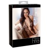 Body à encolure dos nu en dentelle noire, orné d'élégants détails argentés brillants. Ouvert sur le devant, il est maintenu par trois délicates chaînes en strass. Le dos est en tissu noir transparent, créant un effet visuel séduisant. Sans entrejambe pour une touche encore plus provocante.
