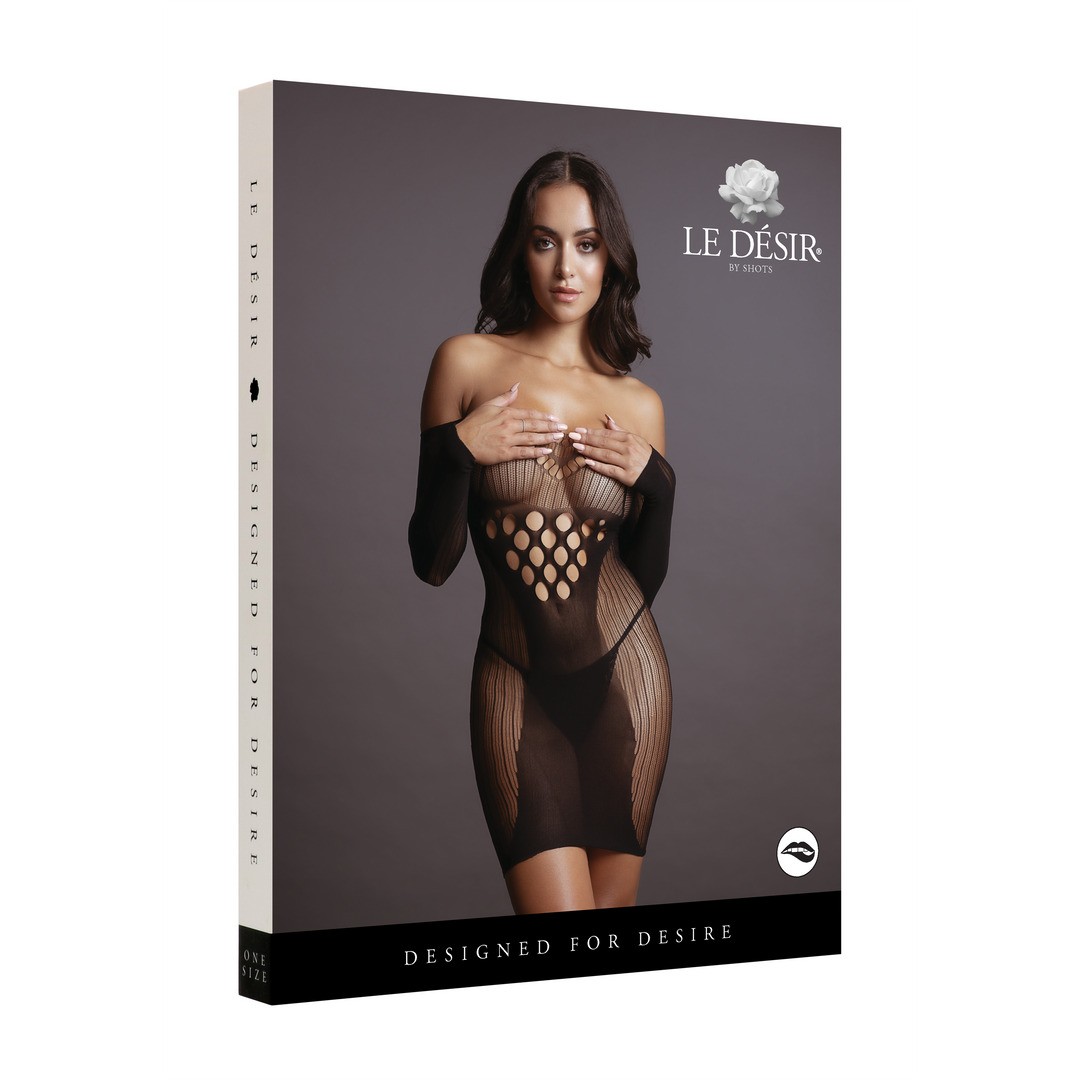Mini-robe Le Désir à manches longues en maille résille avec découpe sous la poitrine et détail opaque contrasté, sensuelle et élastique.