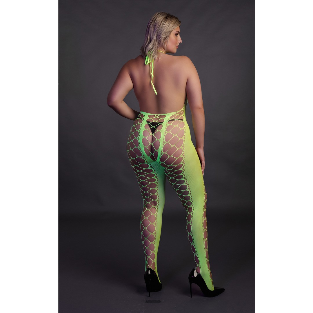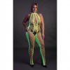 Catsuit néon UV avec décolleté halterneck et entrejambe ouvert, en rose ou vert néon, pour un look audacieux qui illumine la nuit.
