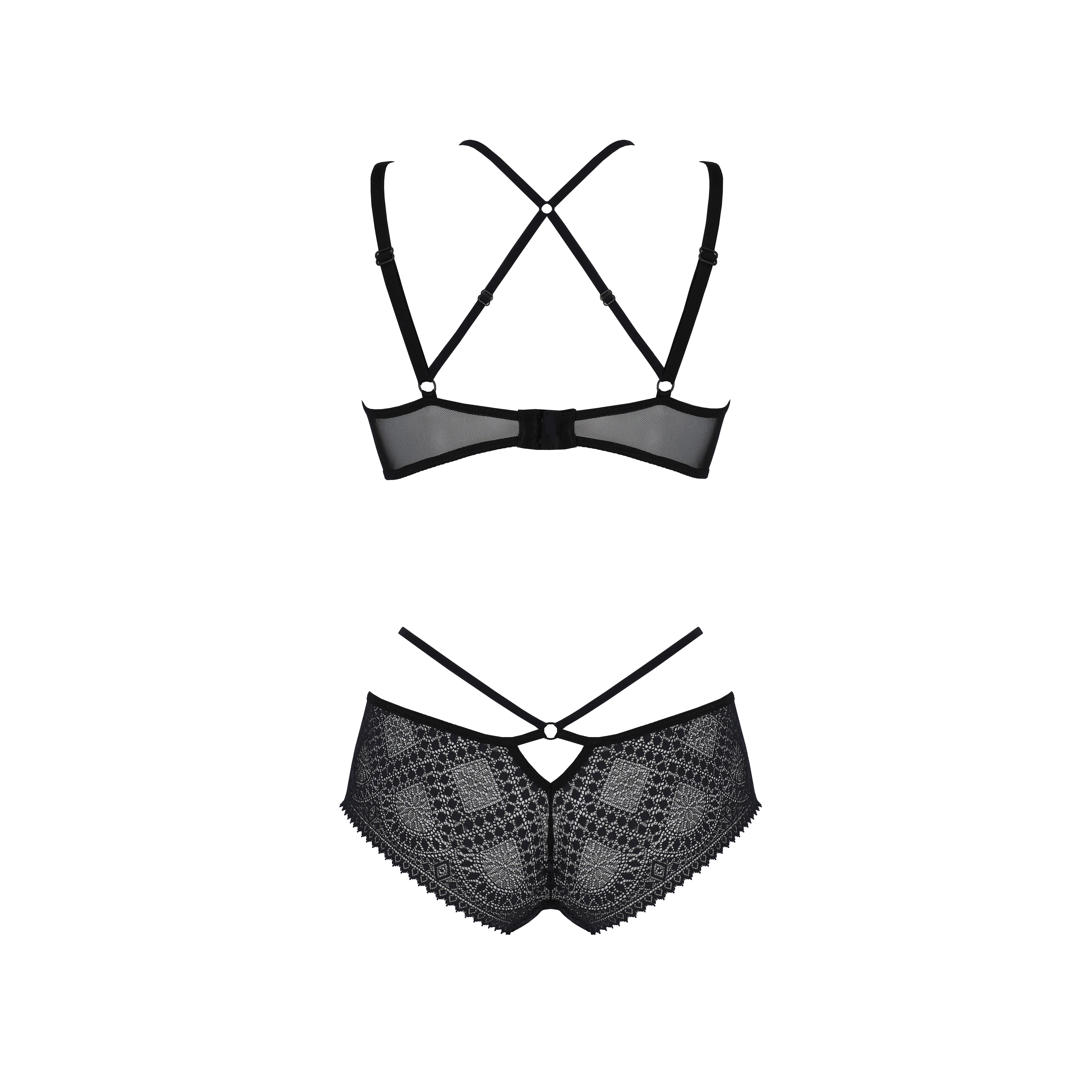 Cet ensemble séduisant de la collection Passion Drosera associe une dentelle noire enchanteresse et des bretelles décoratives qui s'enroulent élégamment autour du buste et des hanches, créant une silhouette sensuelle et enveloppante.