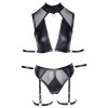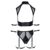 Set BONDAGE di Cottelli composto da top e perizoma, realizzato in un elegante tessuto dall'effetto opaco con inserti trasparenti in powernet. Il top presenta una profonda scollatura e un collo alto con un anello decorativo sul davanti e due bottoni a pressione sul retro per la regolazione. È quasi senza schienale, con una fascia larga dotata di chiusura a gancio per un maggiore sostegno. Su entrambi i lati sono presenti anelli con passanti per le braccia.