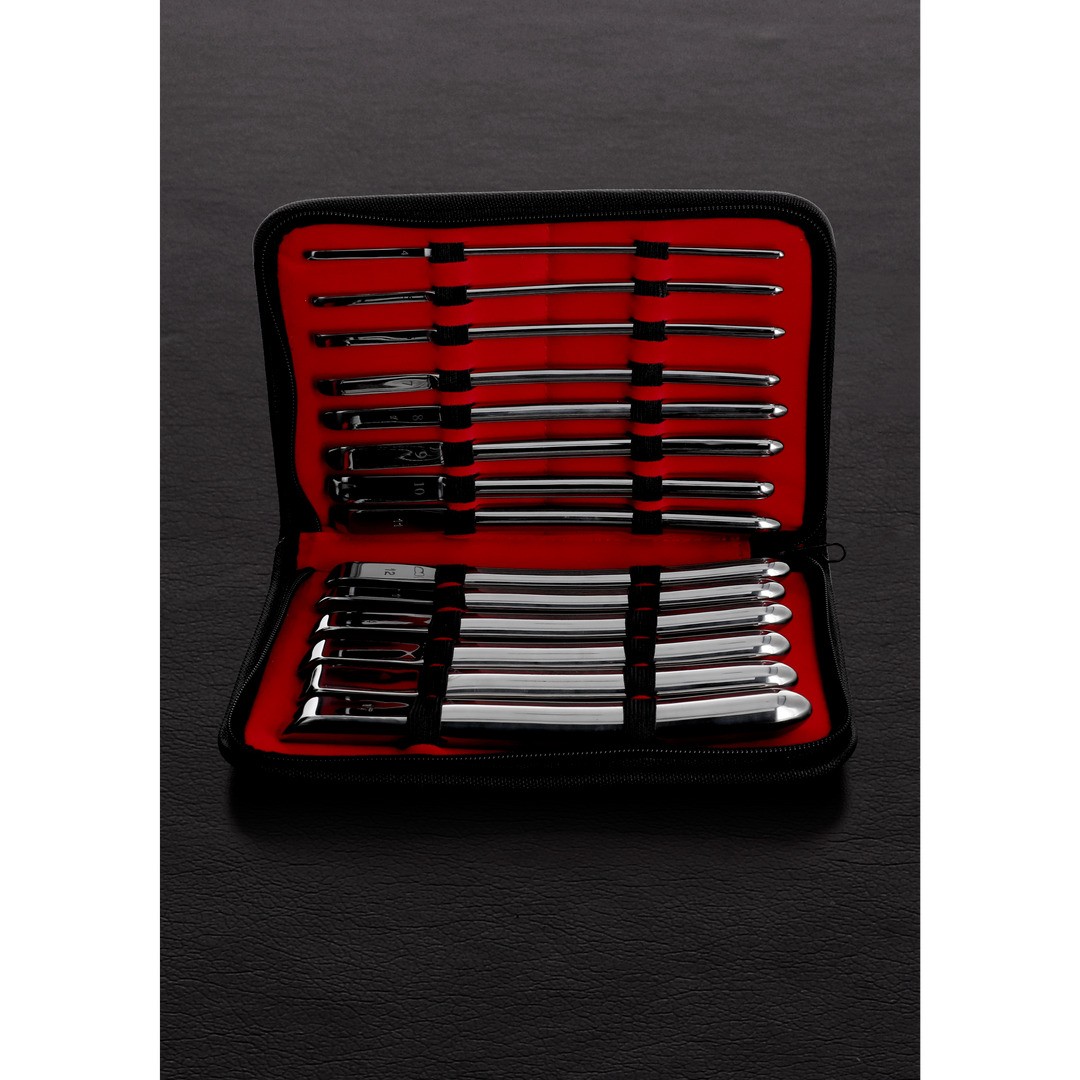 Le sonde per uretra in acciaio inossidabile, con 14 pezzi di diverse dimensioni, sono progettate per facilitare la stimolazione e la dilatazione dell'uretra in modo sicuro e controllato. Ogni pezzo ha un'estremità piatta che consente un miglior controllo e un'applicazione più confortevole, essendo raccomandato sia per i principianti che per gli utenti più esperti. Le dimensioni variano da circa 0,4 a 1,2 cm di larghezza e da 1 a 2,5 cm di lunghezza, offrendo regolazioni precise. Il set include una custodia in pelle rivestita in velluto e tutti i pezzi sono facili da pulire, realizzati in acciaio inossidabile di alta qualità.