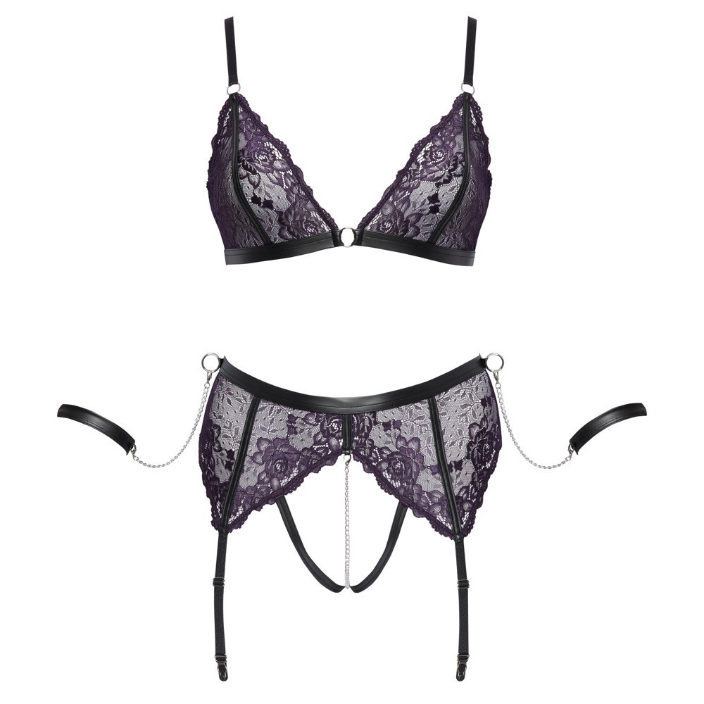 Delicato pizzo color viola scuro con dettagli in nero opaco e anelli e catene argentati. Reggiseno con coppe senza ferretto, spalline regolabili e chiusura con gancio regolabile sul retro. Anche il reggicalze ha un gancio sul retro e cinturini regolabili. Una catena rimovibile e stimolante passa sopra il cavallo aperto. Le cinghie con catene a gancio possono essere fissate agli anelli su entrambi i lati della vita alta. Le morbide fasce sono facili da indossare e da togliere grazie alle chiusure con gancio e laccio regolabili.