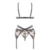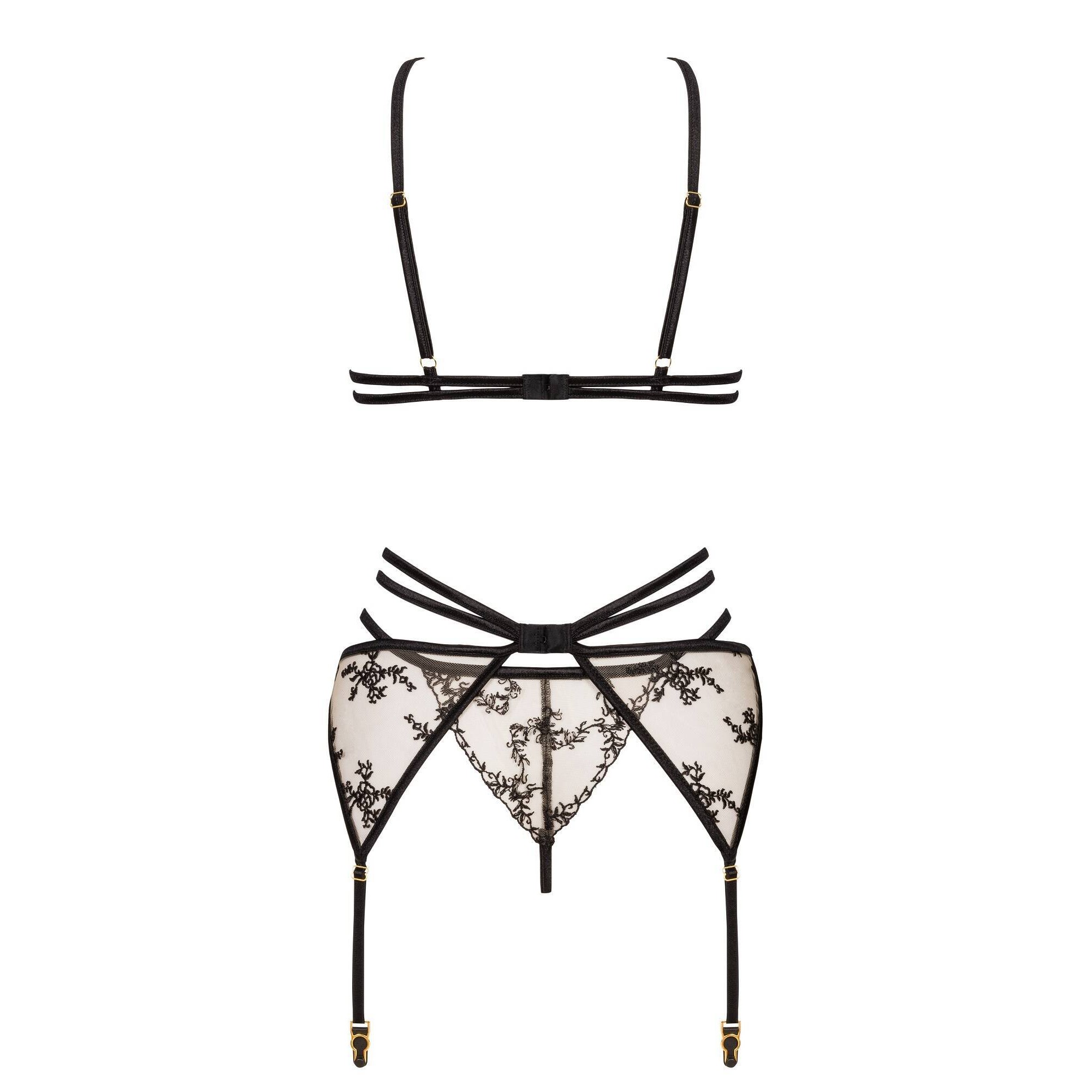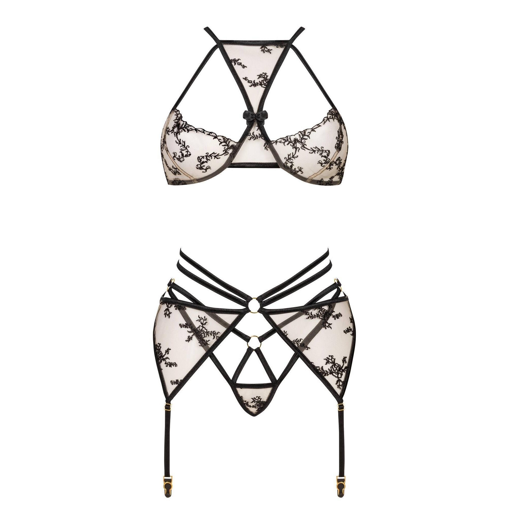 Set esclusivo ed estremamente sexy composto da reggiseno, reggicalze e perizoma. Questo set eccezionale, realizzato in tulle nudo e ornato da un motivo floreale nero, accentuerà la vostra bellezza naturale e vi farà sentire sensuali e lussuose.