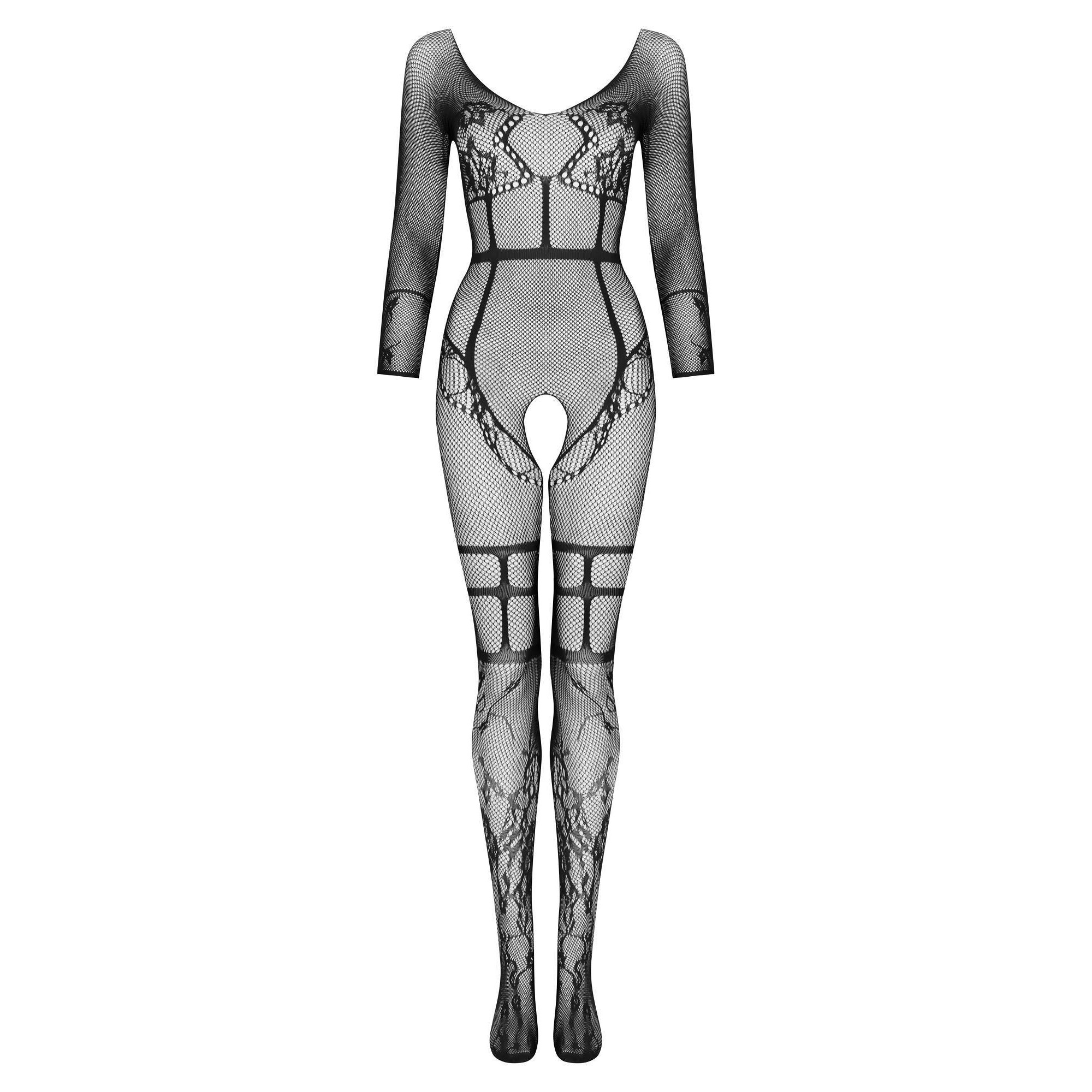 Catsuit super sexy per le amanti dell'intimo confortevole, realizzato in filato nero e delicato. Il motivo a rete è completato da applicazioni floreali di grande effetto e da spalline in vita e sulle cosce.