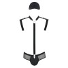 Questo set comprende un perizoma in pelle per uomo con un girocollo, un'imbracatura a tracolla e un cappuccio.