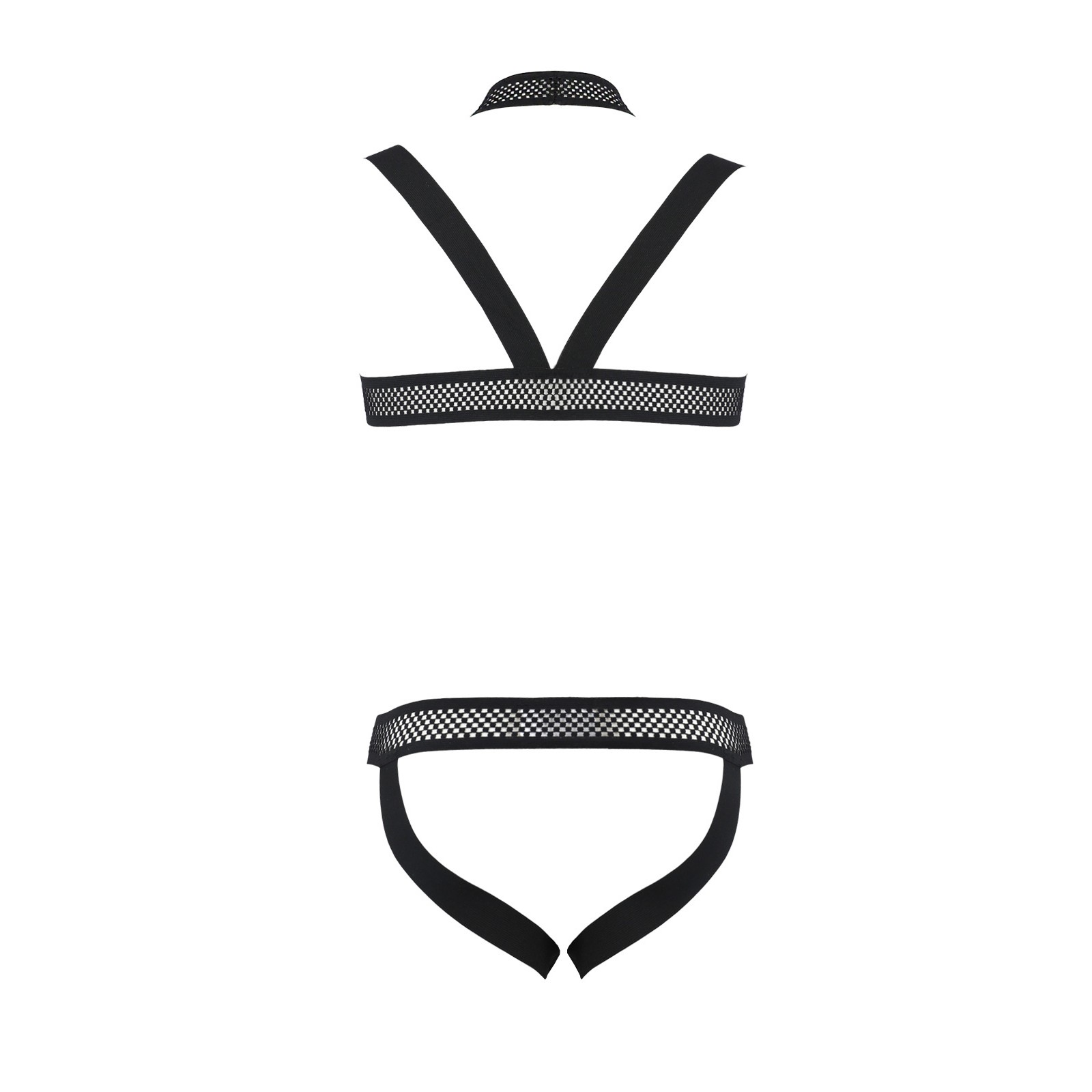 Questo set è realizzato con una combinazione di ecopelle e rete elastica. La parte anteriore delle mutandine e dell'imbracatura è decorata con due anelli di metallo, che conferiscono un aspetto elegante e permettono di combinarle con vari altri accessori.