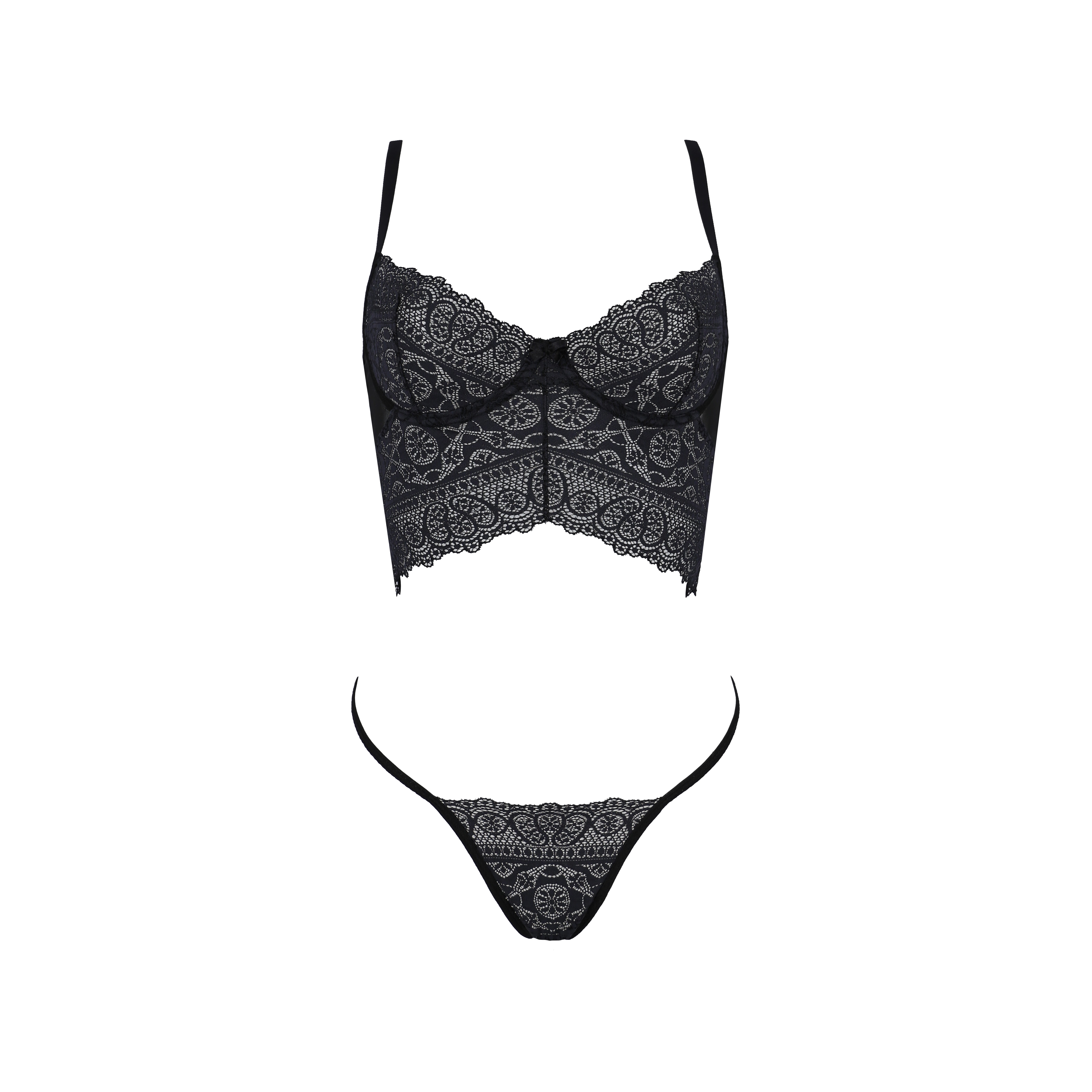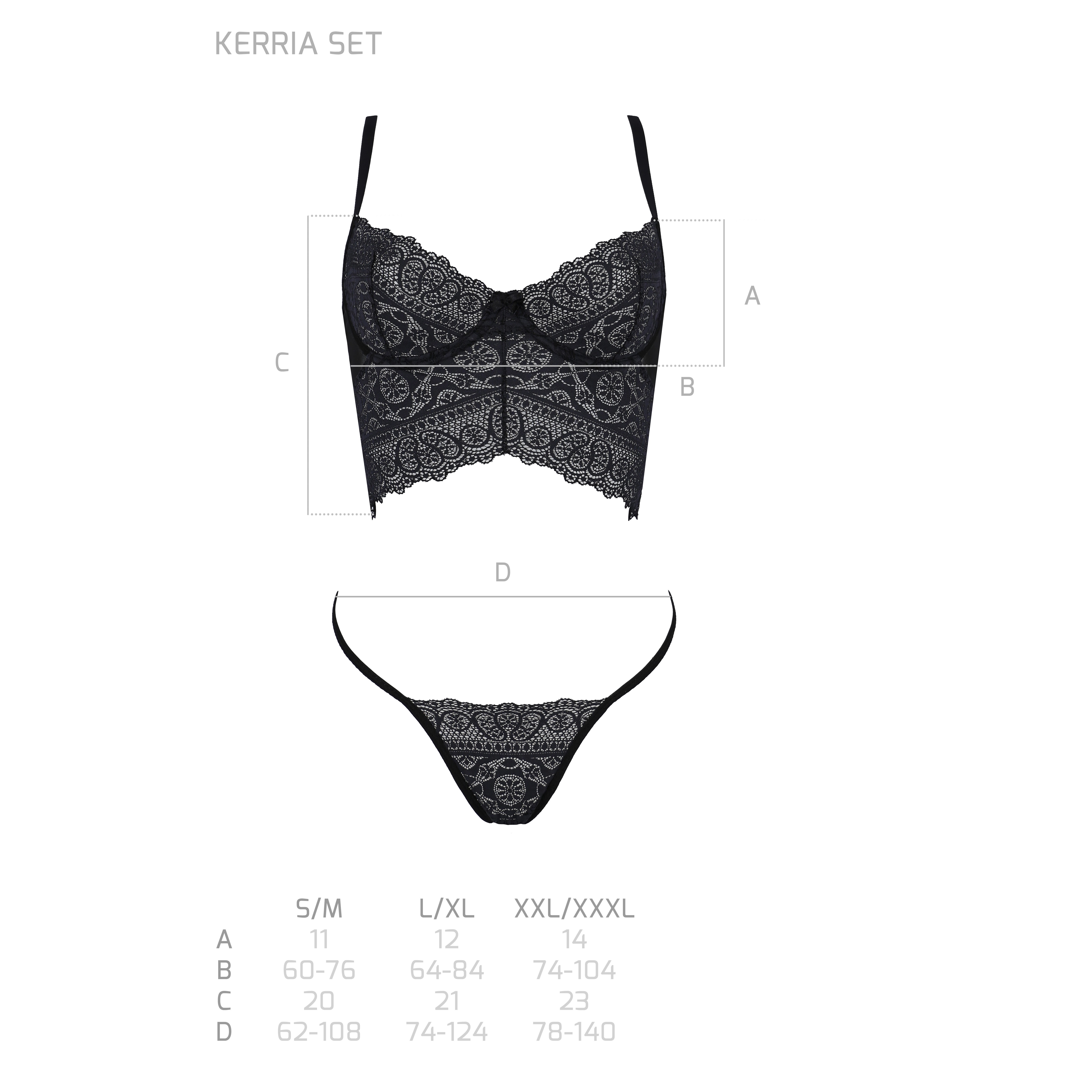 Realizzato in materiale nero di alta qualità, il set si distingue per il taglio insolito e la delicatezza del pizzo femminile che decora sia il reggiseno che il perizoma.
