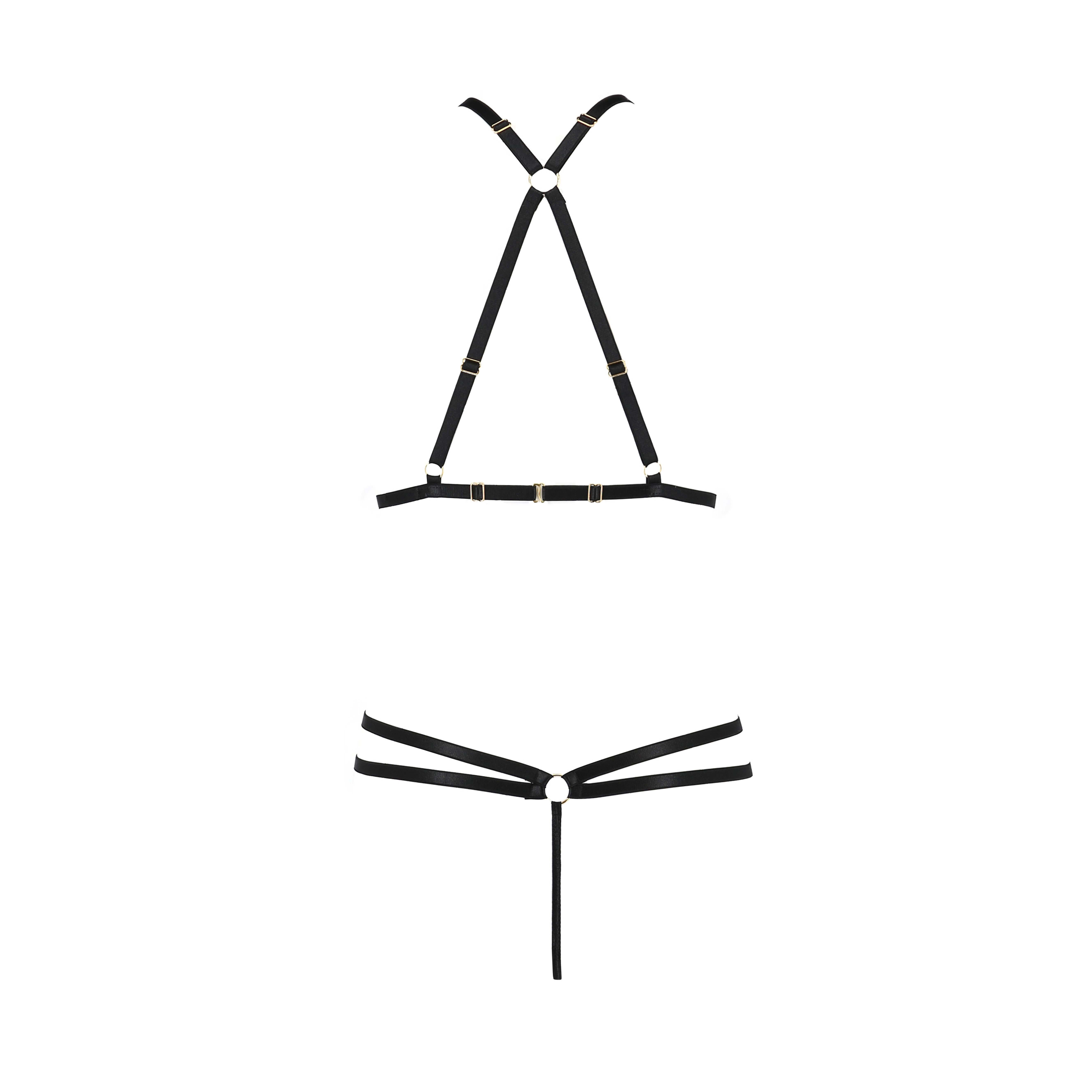 Composto da un reggiseno aperto, un perizoma altrettanto audace e un intramontabile girocollo, questo set è stato creato per enfatizzare le caratteristiche della silhouette femminile.