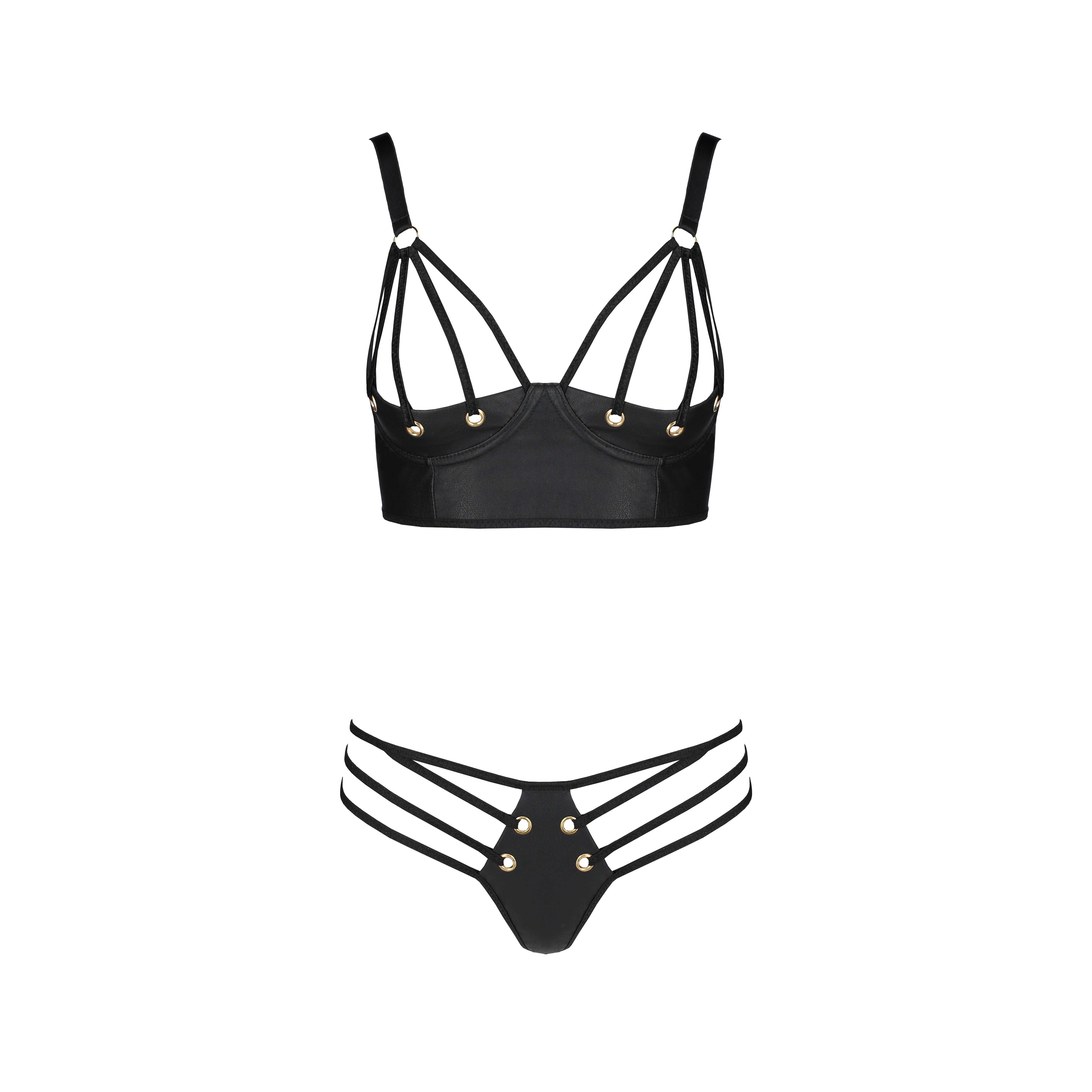 Il set MALWIA BIKINNI del marchio Passion, composto da reggiseno e perizoma, è unico per il suo design audace, con spalline che adornano il reggiseno aperto e cerchi che modellano e valorizzano il seno. Il perizoma segue lo stesso design, offrendo un ulteriore fascino che rende questo set irresistibile.