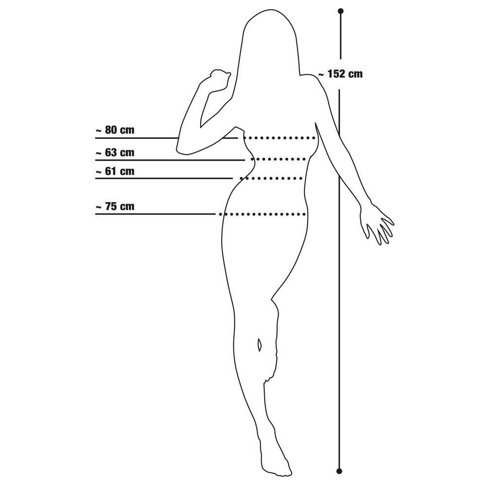 Medidas: busto 80 cm, sub-busto 63 cm, cintura 61 cm, ancas 75 cm.
